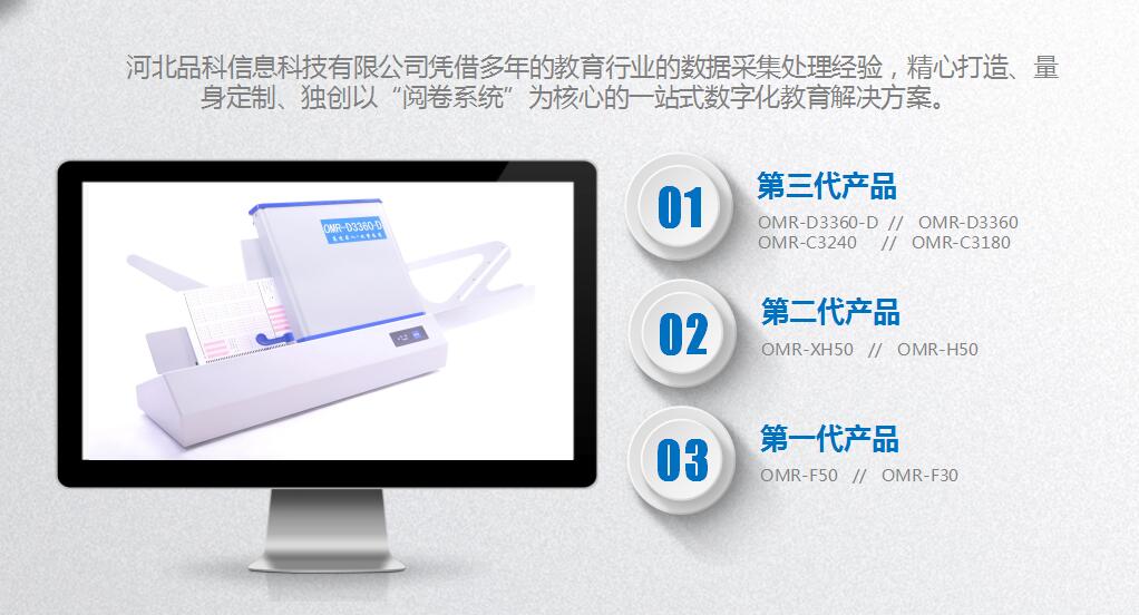河北品科信息科技有限公司,是集生產、研發和銷售為一體的高科技企業,目前主要從事考試光標閱讀機(簡稱OMR:Optical Mark Reader)、教學觸控一體機、網上閱卷系統和考試答題卡及其相關產品(機讀卡、軟件)的開發生產和銷售。 公司自成立以來,依托雄厚的技術實力和研發背景,和佳能、松下等國際硬件廠商合作,一直致力于自有知識產權軟硬件的產品的研制和開發,在數據處理產品領域(OMR)推出了一系列具有國內外水平的產品,已擁有三個系列的光標閱機產品,為廣大用戶提供而完善的解決方案,可靠而安全的系統集成,優質而周到的技術服務,應用范圍覆蓋了教育、郵電、通訊、金融、證券、稅務、統計等諸多領域,產品遠銷海內外多個國家和地區。