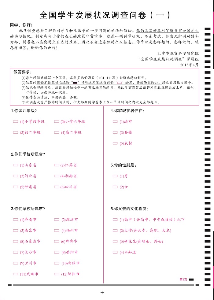 全國(guó)學(xué)生發(fā)展?fàn)顩r調(diào)查問(wèn)卷